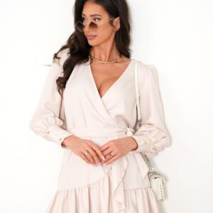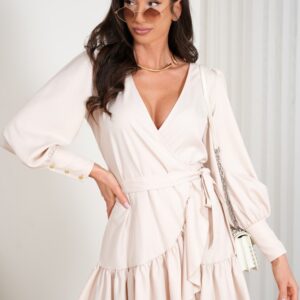 Krótka sukienka z długim rękawem to kobieca i elegancka propozycja na różne okazje. Wykonana z lekkiego, przyjemnego w dotyku materiału, zapewnia komfort noszenia i swobodę ruchów. Przód kopertowy z dekoltem w serek subtelnie podkreśla sylwetkę, dodając jej wdzięku. W talii znajduje się wiązanie, które pozwala na idealne dopasowanie do figury, podkreślając jej atuty. Długie rękawy zakończone szerokimi mankietami dodają sukience elegancji, a falbana u dołu nadaje całości lekkości i romantycznego charakteru. To idealny wybór na spotkania, randki czy wyjątkowe okazje, łączący kobiecość i wygodę w jednym.