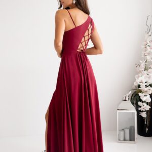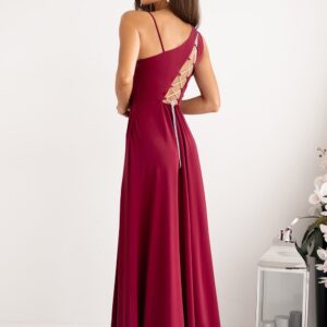 Długa prosta sukienka z asymetrycznymi ramiączkami, jedno cienkie, drugie grubsze. Sukienka odcinana w talii, dół rozkloszowany. Sukienka zapinana na kryty zamek na boku. Na plecach ozdobne rozcięcie z plecionym wiązaniem.