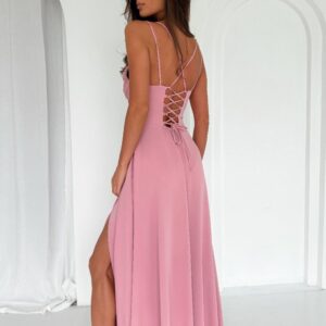 Elegancka, a za razem prosta długa sukienka z rozcięciem u dołu. Sukienka zapinana na kryty zamek. Przód z dekoltem woda z cienkimi ramiączkami, tył z plecionym wiązaniem. Propozycja idealna na wiele okazji.