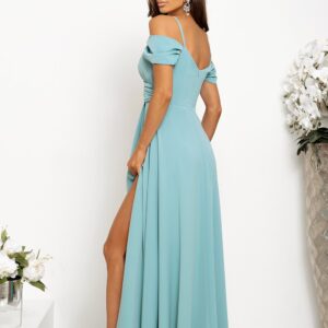 Elegancka długa sukienka z kopertowym dekoltem, cienkimi ramiączkami, oraz rękawkami. Sukienka odcinana w talii zapinana na kryty zamek, dół rozkloszowany z rozcięciem. Sukienka wykonana z lejącego gładkiego materiału.